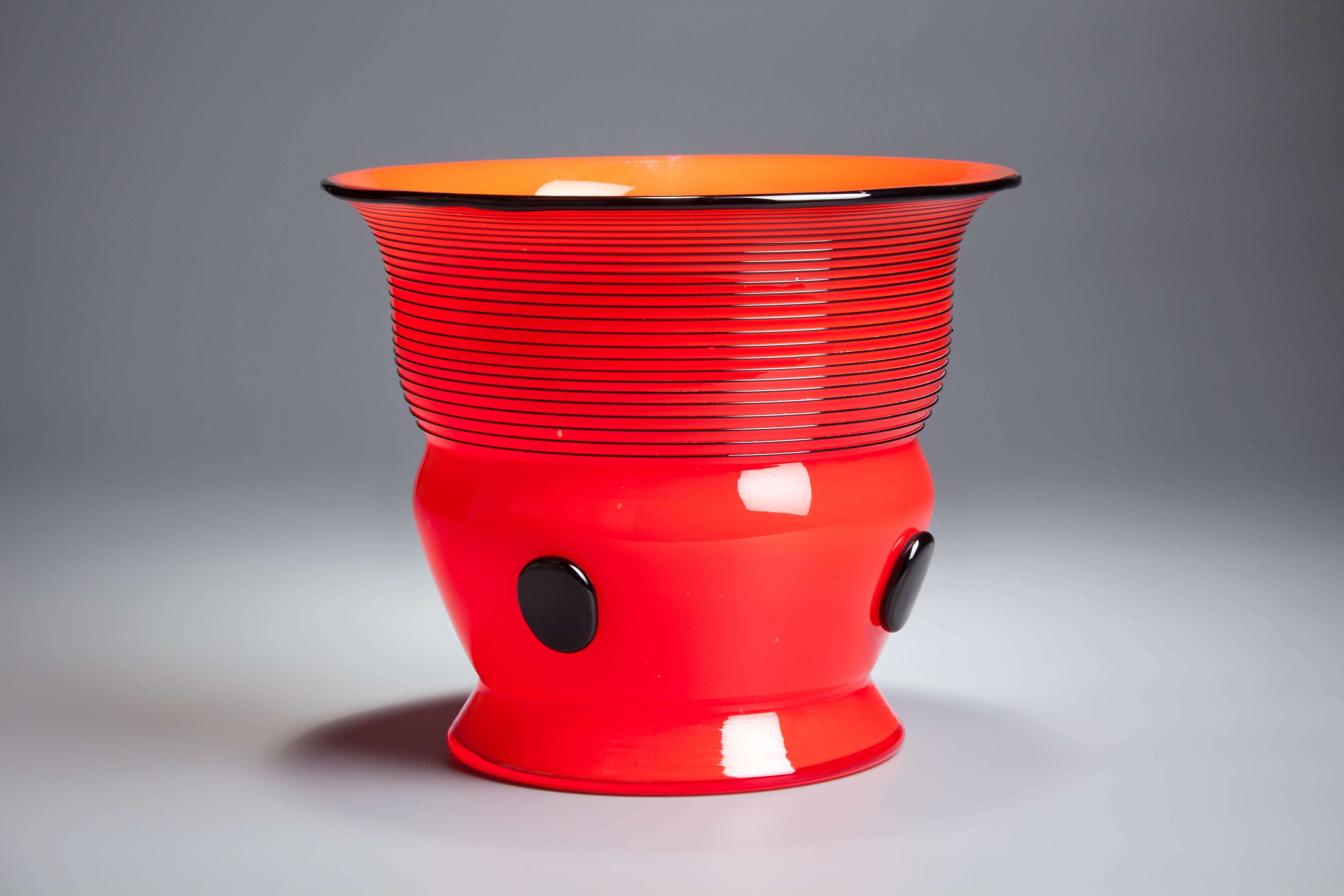 Váza v dekoru Ausführung 166 s barevně kontrastními ovinutými nitka, nitkou okolo okraje a výraznými oválnými nálepy je přímo charakteristickou ukázkou stylu tango skla a nepochybně upoutá ve výstavě i Váš pohled.